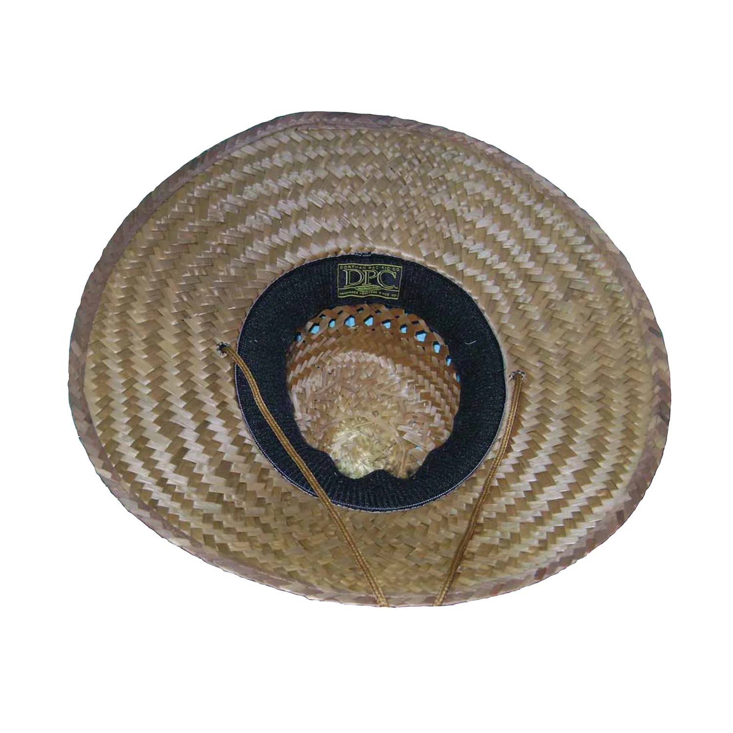 This hat is a safari hat with a band. It is one size fits most and has a chin cord. It also has an inner sweatband and is made of palm fiber.