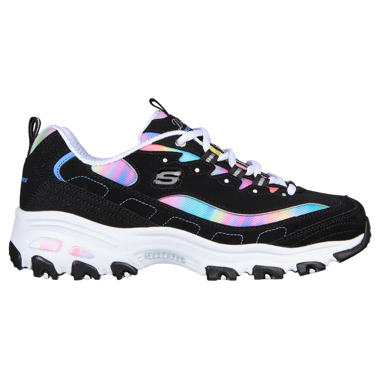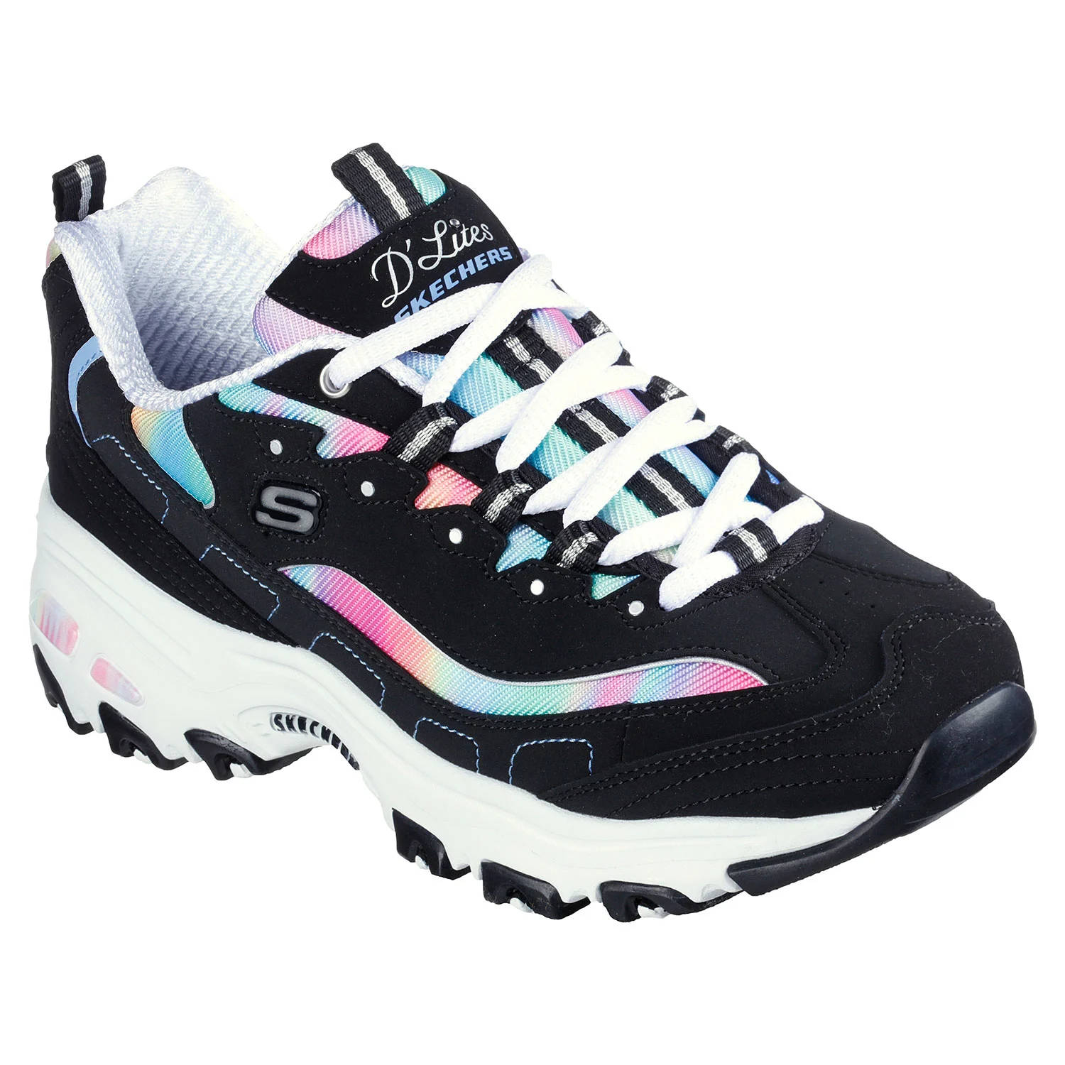Show off some gorgeous colors with a favorite look in Skechers D’Lites®. This fashion lace-up style features a leather, synthetic and watercolor print mesh upper with a cushioned Skechers Air-Cooled Memory Foam® insole.